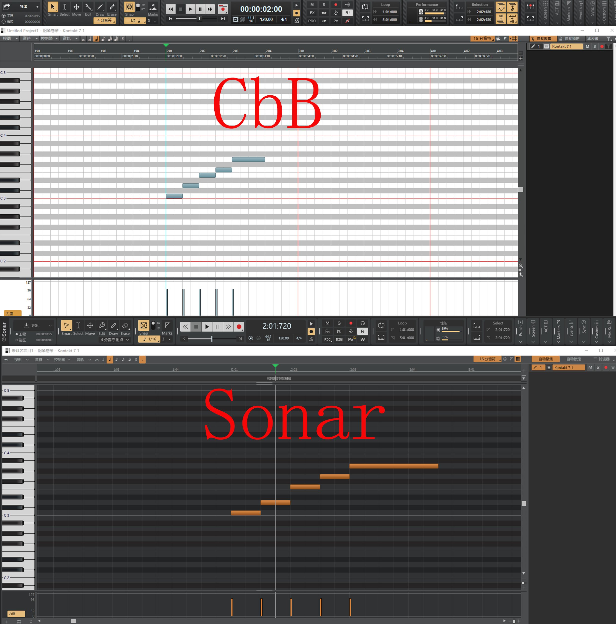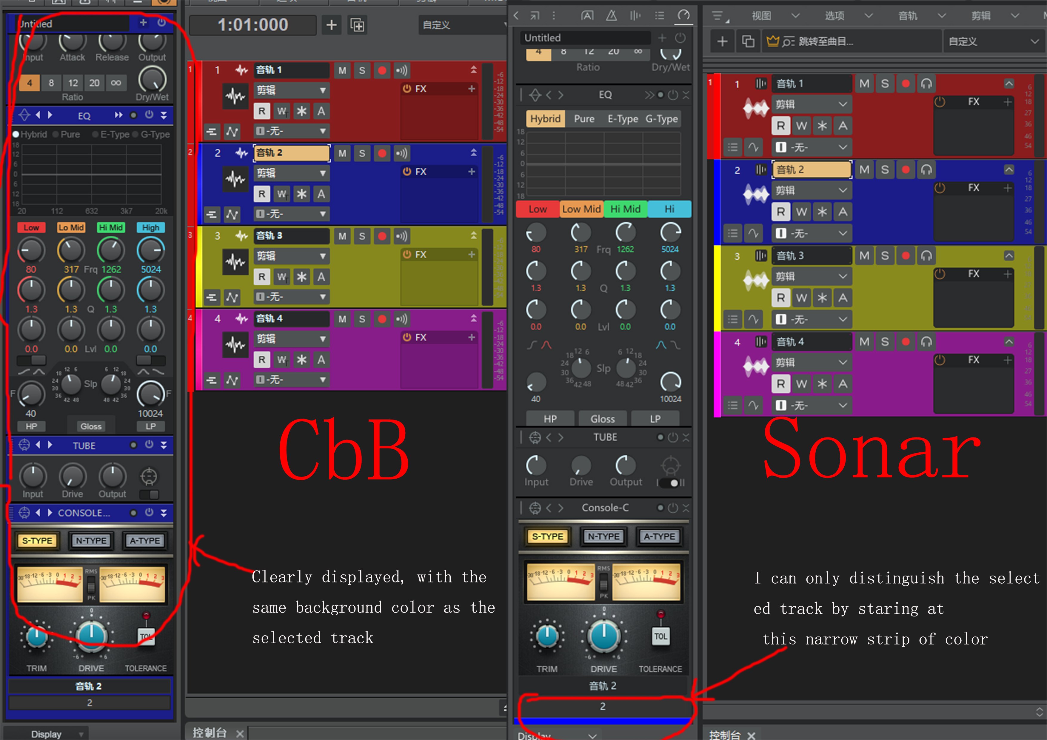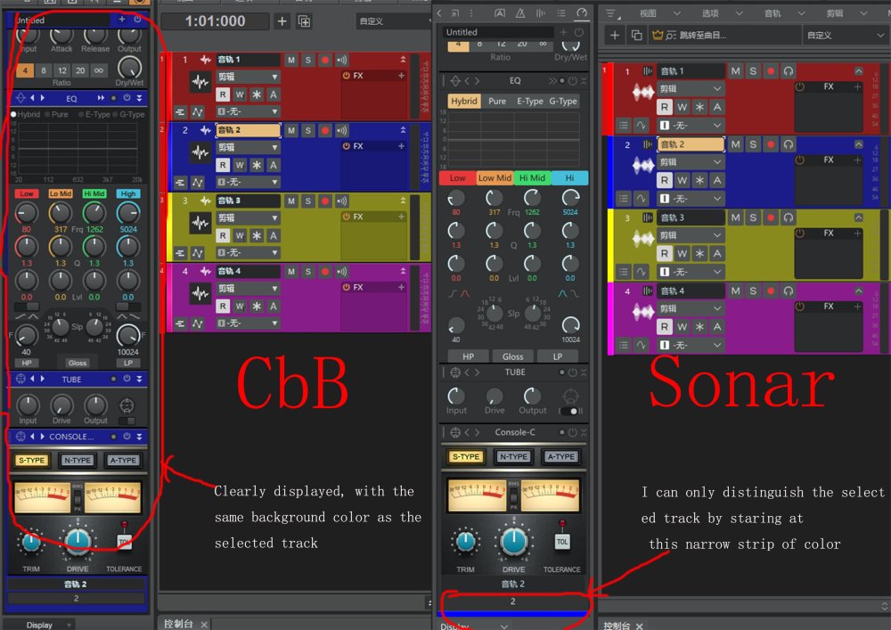 Compare the colors of the channel bars, this is CbB,When there are a large number of tracks, this color makes it easy for me to distinguish which track I have chosen. this is New sonar。The new sonar made me stare wide eyed at the very narrow color in the bottom left corner, even causing me to accidentally operate it。 -