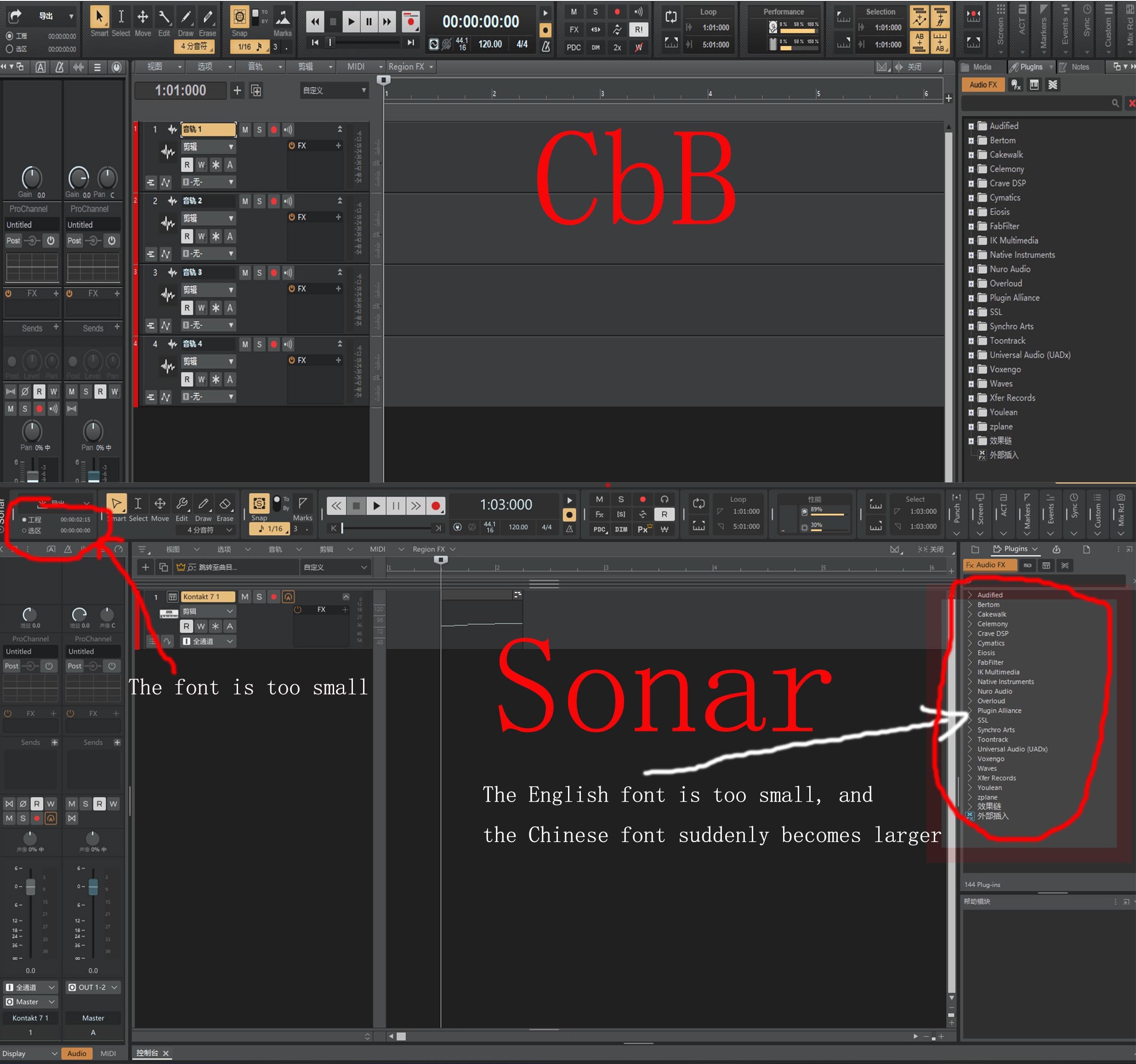 对比新款声呐和CbB,如图所示,如果能单独设置,对于只喜欢使用Cakewalk20多年的老用户来说,那将是无比幸福的。 1、琴窗底色可单独设置,纯黑色主题,琴窗明亮。新声呐的黑色背景在32或64分音符,让衰老的眼睛难以阅读 2、CbB中左声道条的背景颜色与所选轨道相同,但新声呐消失了,只能参考底部的窄色。 3、CbB右侧Plugis目录下的字体清晰度不如新Sonar,但Sonar的字体更小,左上角的项目和选择字体也太小,无法阅读。 Undoubtedly, the startup speed and optimization of the new Sonar are improving at a visible pace, but my aging eyes have forced me to pause on CbB. I hope Sonar's engineers can restore these color settings and make them more user-friendly. Thank you, cakwalk, thank you, sonar!