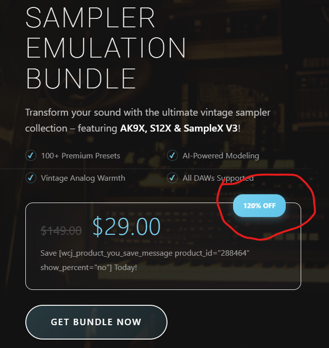 1. From the page - this cracks me up. I'm no Fields Medal winner, but something is a little off with their math. $29 down from $149 is actually about 80.5% off. To get to 120%, they would have to pay me about $30 to take their Sampler Emulation Bundle. Which I would. Hey Beatskillz let me know and I'll send you my Paypal, and where to send the licenses. Of course, they probably mean $120 off, which makes more mathematical sense.