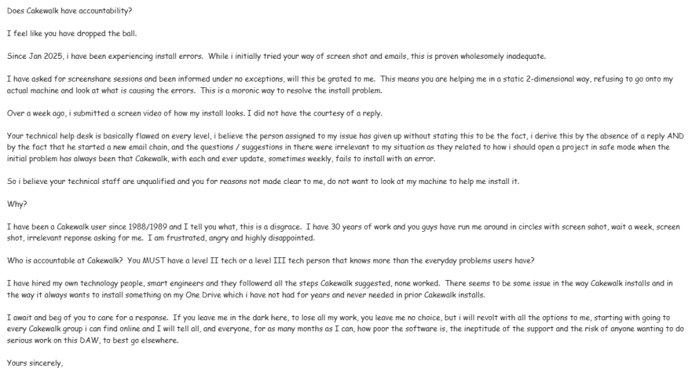 I await and beg of you to care for a response. If you leave me in the dark here, to lose all my work, you leave me no choice, but i will revolt with all the options to me, starting with going to every Cakewalk group i can find online and I will tell all, and everyone, for as many months as I can, how poor the software is, the ineptitude of the support and the risk of anyone wanting to do serious work on this DAW, to best go elsewhere.