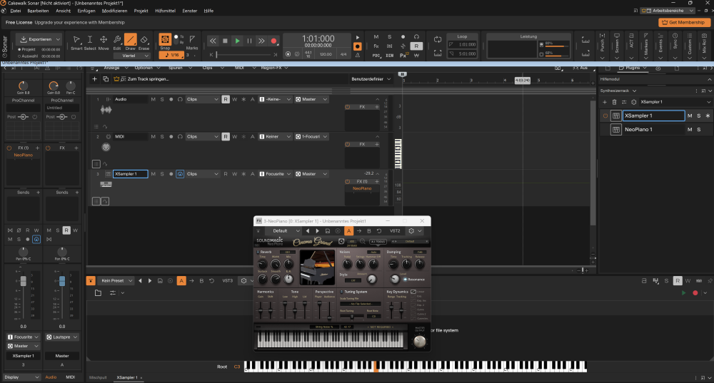 5. I have a Midi keyboard connected to the Focusrite Audio/Midi Interface. If I select Track 2 I see the midi signals when I touch the keyboard. So the MIDI Interface is setup correctly and and is working. If I select Track 3, where I have NeoPiano which I can hear if I click the soft keyboard of the Plugin, but it If I touch the keys of my real keyboard it never reaches the Plugin. What I'm missing?