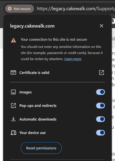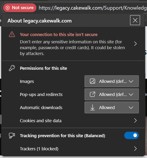 Removing the "s" from "https://" works for images but it technically removes the security layer from the site. However, even with the "s" the site appears to be unsecure: In Chrome, to show pics w/o removing the "s", set the following: Settings>Privacy and security>Content>Images>Default behavior>Sites can show images Settings>Privacy and security>Content>Images>Allowed to show images>[*.]cakewalk.com (This should cover all cakewalk.com sites. If not, you can add each site individually.) Settings>Privacy and security>Content>Pop-ups and redirects>Default behavior>Sites can send pop-ups and use redirects Settings>Privacy and security>Content>Pop-ups and redirects>Allowed to send pop-ups an redirects>[*.]cakewalk.com For downloading files, removing the "s" doesn't work anymore in Chrome. It replaces the "s" blocking them. Edge settings are similar, but for downloading files it warns you they can't be downloaded securely but gives you the option to keep them anyway. As time goes on, browsers are making unsecure sites more and more difficult to navigate. https://legacy.cakewalk.com needs to be fixed if it's going to be of any value in the future. -