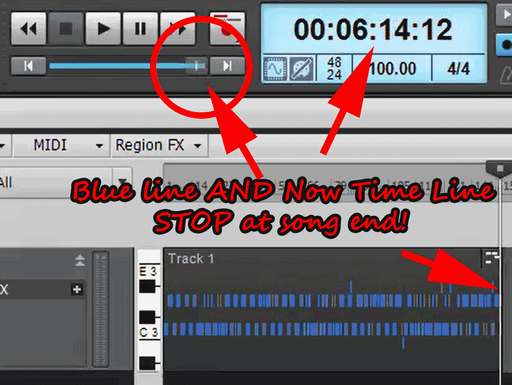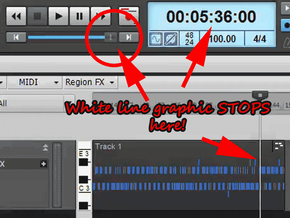 Maybe the slider needs cleaning??? You may notice the white indicator line also doesn't start moving right away when transport is initiated. This is by design. The square Indicator graphic is 20 pixels wide and starts moving when the blue line 1st reaches it, but stops when it reaches the end while the blue line continues moving behind it. Watch this short video or insert this 50% transparent indicator graphic into a theme and see for yourself.