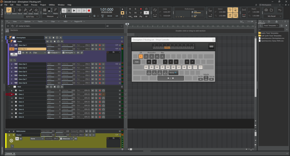 Para mi es obvio que hay algun problema o en omnisphere o la suma de omnisphere y sonar. He descargado el proyecto que me has facilitado,gracias, (pero el problema persiste) Podrias hacer esta prueba para confirmarlo por favor?. Si tocas algo en el canal midi 2 (Omn2) al tocar suena la guitarra en el Omn out 2, hasta ahi todo ok. Ahora en el canal omn out2 cambia B output audio bus 3+4 por None Comprueba que la guitarra suena ahora en omn out 3 que es la salida C (algo que no deberia ocurrir porque esta configurado para sonar solo en la B). Podrias comprobarlo por favor, gracias de nuevo. -