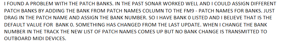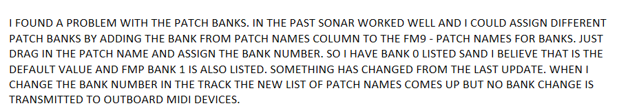 Wayne Bangert Posted 4 hours ago Share Posted 4 hours ago I FOUND A PROBLEM WITH THE PATCH BANKS. IN THE PAST SONAR WORKED WELL AND I COULD ASSIGN DIFFERENT PATCH BANKS BY ADDING THE BANK FROM PATCH NAMES COLUMN TO THE FM9 - PATCH NAMES FOR BANKS. JUST DRAG IN THE PATCH NAME AND ASSIGN THE BANK NUMBER. SO I HAVE BANK 0 LISTED AND I BELIEVE THAT IS THE DEFAULT VALUE FOR BANK 0. SOMETHING HAS CHANGED FROM THE LAST UPDATE. WHEN I CHANGE THE BANK NUMBER IN THE TRACK THE NEW LIST OF PATCH NAMES COMES UP BUT NO BANK CHANGE IS TRANSMITTED TO OUTBOARD MIDI DEVICES. Link to comment Share on other sites More sharing options...