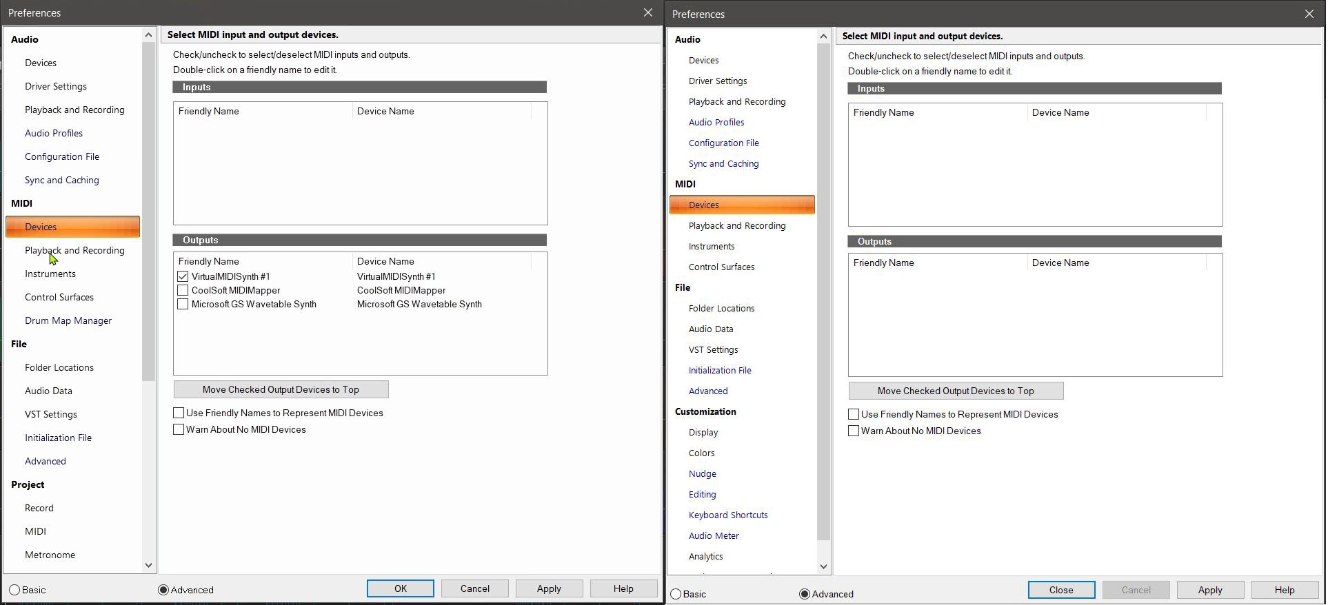 quattj Posted 5 hours ago Author Posted 5 hours ago (edited) 1 hour ago, Jonathan Sasor said: We didn't remove anything. It's dependent on what Windows is exposing as a MIDI port. We default to using WASAPI for integrated audio cards these days as it has much better performance in general, but you may see the Wavetable synth if you change the audio driver mode to MME. Even if nothing was removed, something is not working the same in Sonar as it did in Cakewalk for MIDI playback devices. With MME selected as the MIDI driver mode, no inputs or outputs are shown. If I switch the MIDI driver mode to UWP, I can then see Microsoft GS Wavetable Synth as an output. However, either way it completely ignores/bypasses any of my system MIDI settings to use Coolsoft VirtualMIDISynth as the playback device, and playback sounds like garbage. I believe VirtualMIDISynth showed up as a separate device in Cakewalk, but now I have no way of checking. I do know that it played back properly as expected in Cakewalk, as no matter which app I played back with, it was and still is correct except for in Sonar. Changing the driver mode in the audio section has no effect on the MIDI section. Nothing has changed on my system (Windows 10 Home 22H2) since the last time I successfully used Cakewalk to edit my MIDI files on September 24th, except that I have now had to install Sonar. Edited 5 hours ago by quattj