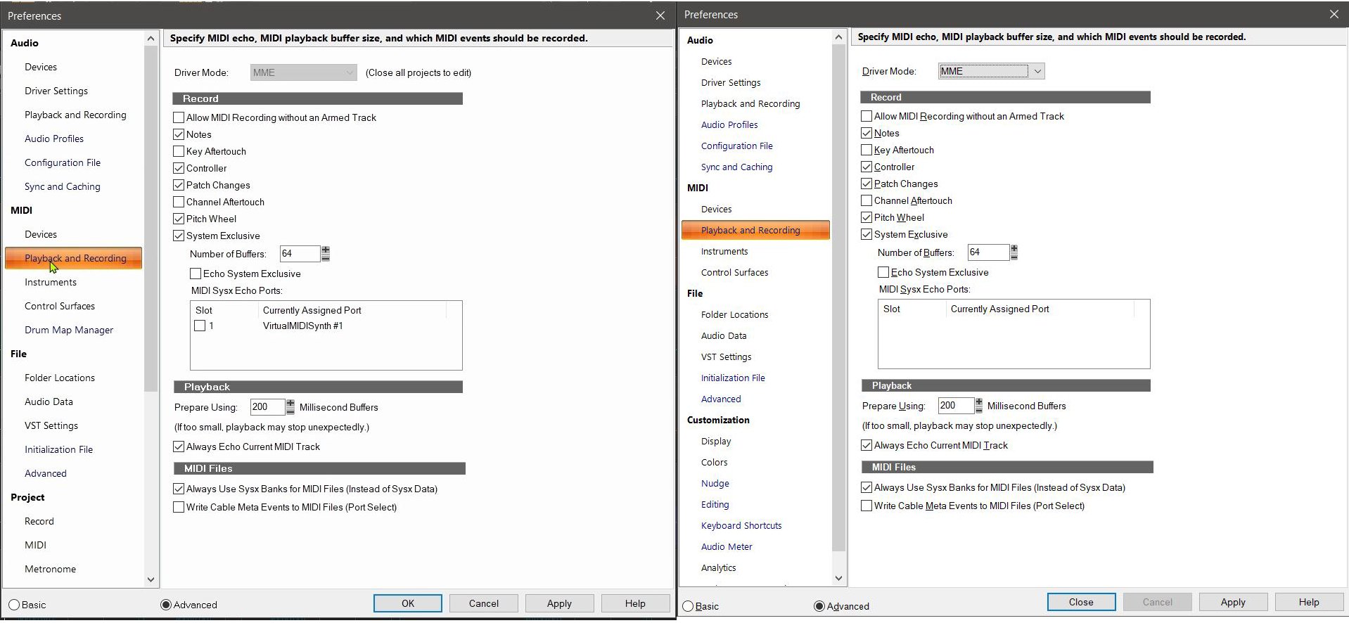 quattj Posted 47 minutes ago Author Posted 47 minutes ago I did a recording of creating one of my soundtracks, and luckily I had an issue where I ran through all of the settings to check them, so I was able to pull screenshots of Cakewalk settings from the video to compare with Sonar. Both programs have "WASAPI Shared" selected under Audio->Playback and Recording I've attached screenshots of the comparison of Cakewalk vs Sonar for the MIDI preferences for ->Playback and Recording and ->Devices. Cakewalk on the left, Sonar on the right. All setting are identical, except that all devices are missing in Sonar.