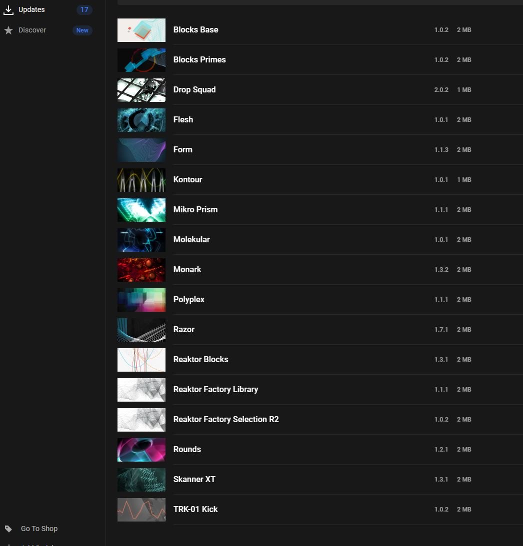 ZincT Posted 1 hour ago Posted 1 hour ago (edited) I had 17 updates listed: The vast majority of these have the following change in their Release Notes: ## ADDED NICNT file for optimized Native Access experience. With a couple of other updates for specific plugins: Form V 1.1.2 Changes Missing content after updating from 1.0.1. Mikro Prism V1.1.0 NKS compatibility Reaktor Factory Selection R2 V1.0.1 Browser previews for Komplete Kontrol and Maschine Also Kontour and Razor have no Release Notes available. Edited 1 hour ago by ZincT