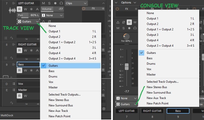 Bass Guitar Posted 5 hours ago Posted 5 hours ago First once you create a bus you simply change the output of any tracks that you want to go there. Make sure that the bus is going to the Master. I find that this is easier to visualize in the console view. Look for the output at the bottom of the channel strip. The use of compression is an open ended topic. But generally speaking with guitars you will want it on the track. Either use the pro channel modules or a 3rd party plugin in the FX bin. You don’t normally want to use heavy compression globally because if there are 4 instruments feeding the compressor the loudest one will kill the rest. You normally use them track by track. You can also use one on a bus but then normally it would be set for limiting. not compression. That said there are no rules about using any effects. Just common practice. Compression on guitar is pretty standard and my favourite is using the stomp box found in THU.